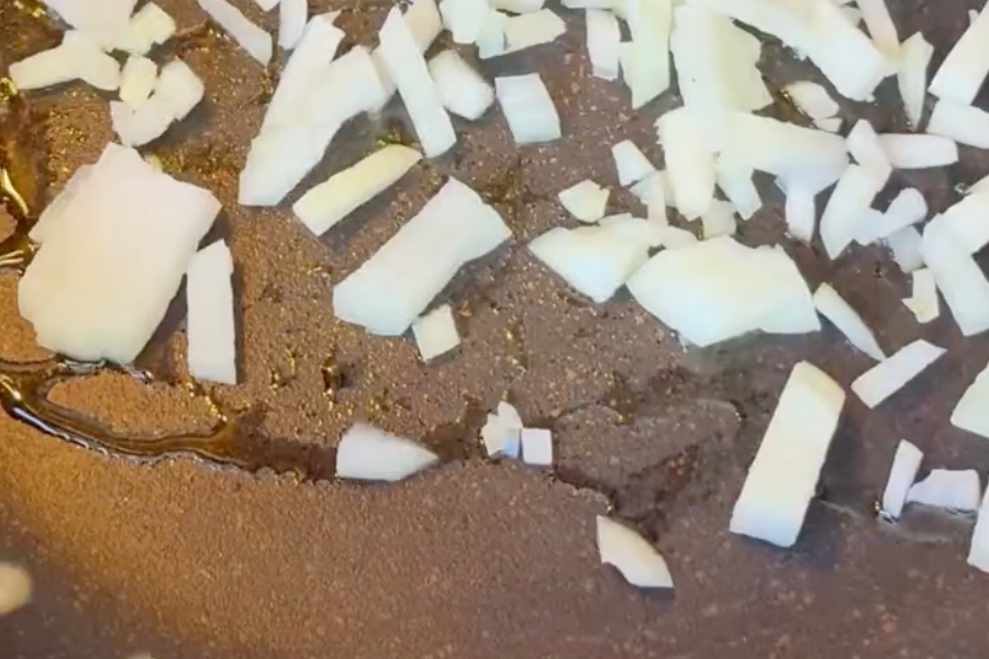 • Heat oil or butter in a pan. Add chopped onion and sauté until soft and slightly golden.