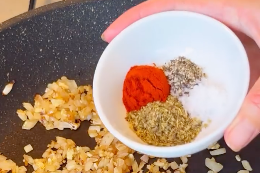 • Add garlic and cook for 30 seconds. Then add paprika, oregano, salt, and pepper.