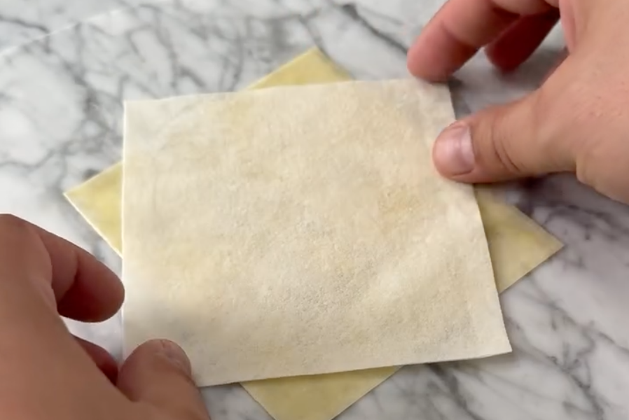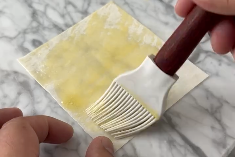 Lay out the wonton wrappers on a clean surface. Brush them lightly with melted butter or oil. You do not need to soak them, just a thin layer is enough.