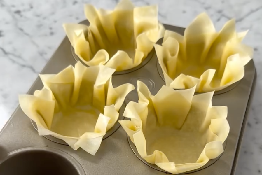 Place each wrapper into a muffin tray. If you want better structure, use two wrappers placed slightly off angle. This small detail makes a difference because the cups hold shape better after baking.