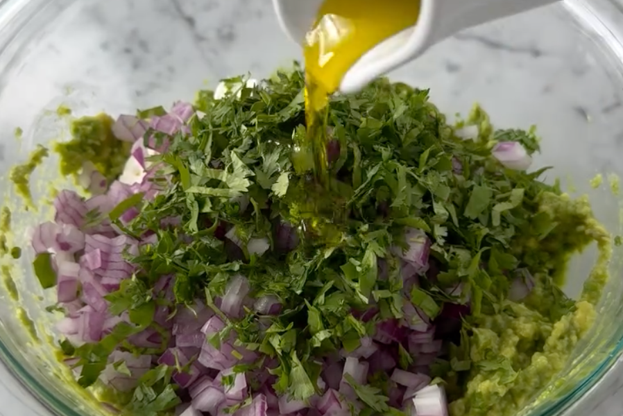 Add finely chopped onion and coriander. These ingredients are not just for flavor, they also break the richness of avocado.
