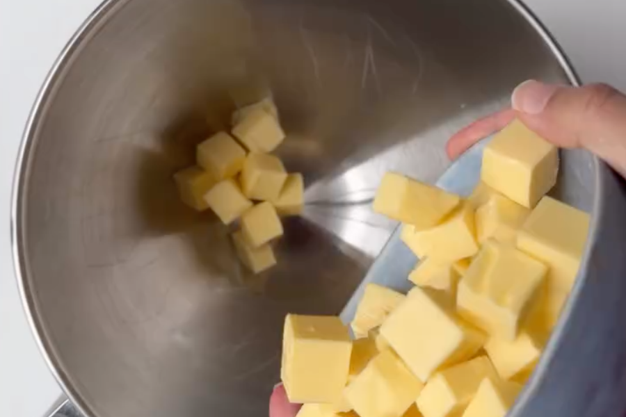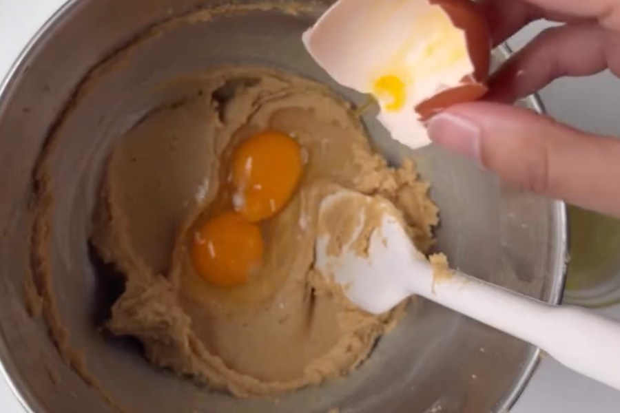 • In a large bowl, beat softened butter until smooth. Add brown sugar and granulated sugar, then mix until fully combined and slightly creamy.