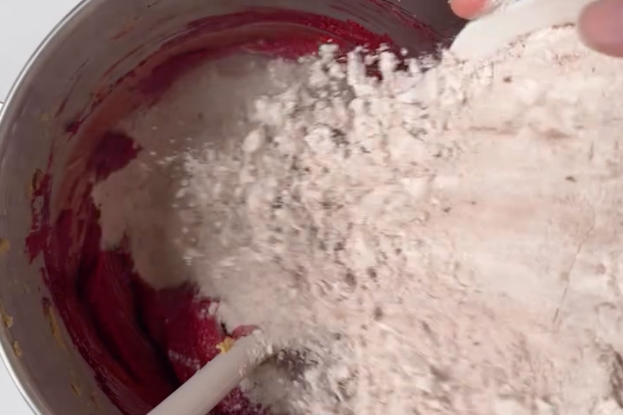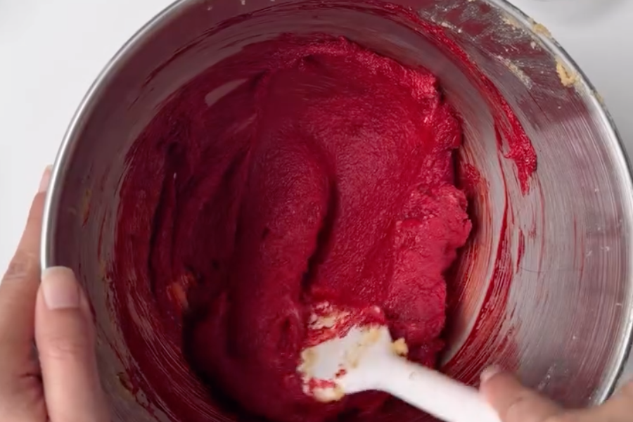 • Add red food coloring gradually and mix until the dough turns evenly deep red.