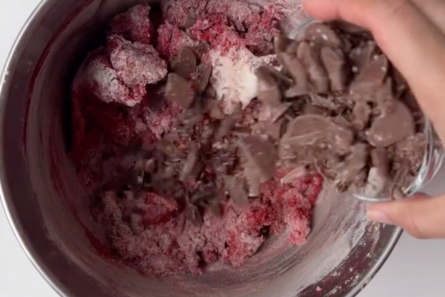 • Fold in white and milk chocolate chunks evenly through the dough.