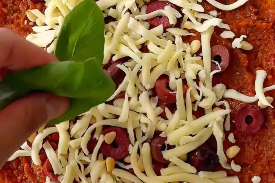 • Line a baking tray with parchment paper. Spread and shape the mixture into a medium-thick pizza base.