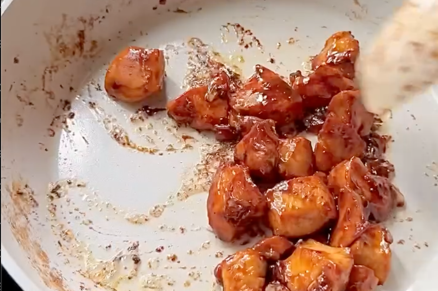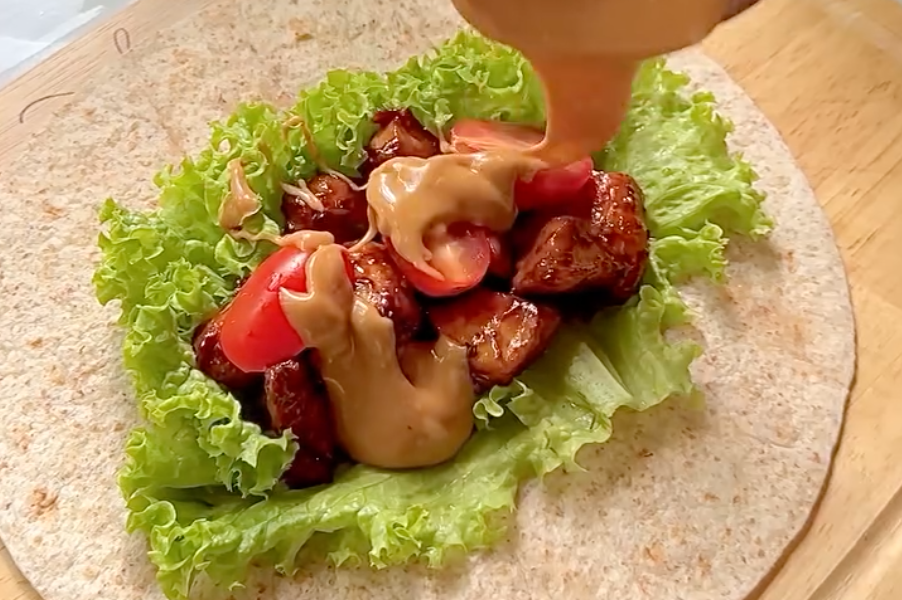First, the chicken is cooked until the sauce becomes slightly sticky and coats every piece. This is important. If the sauce is watery, your wrap will be weak and messy.