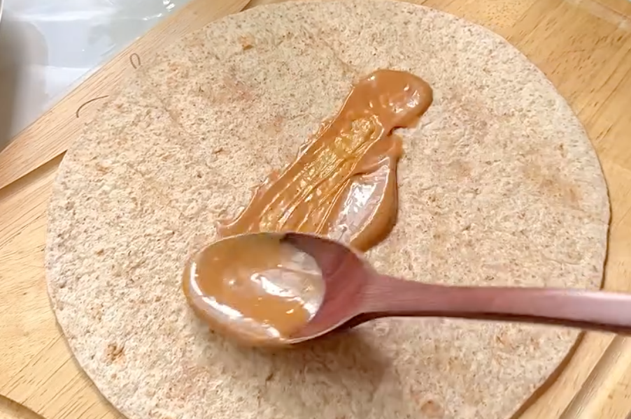 Spread a layer of the creamy sauce in the center. Don’t spread it all over. Keep it in the middle area so it doesn’t leak out when wrapping.