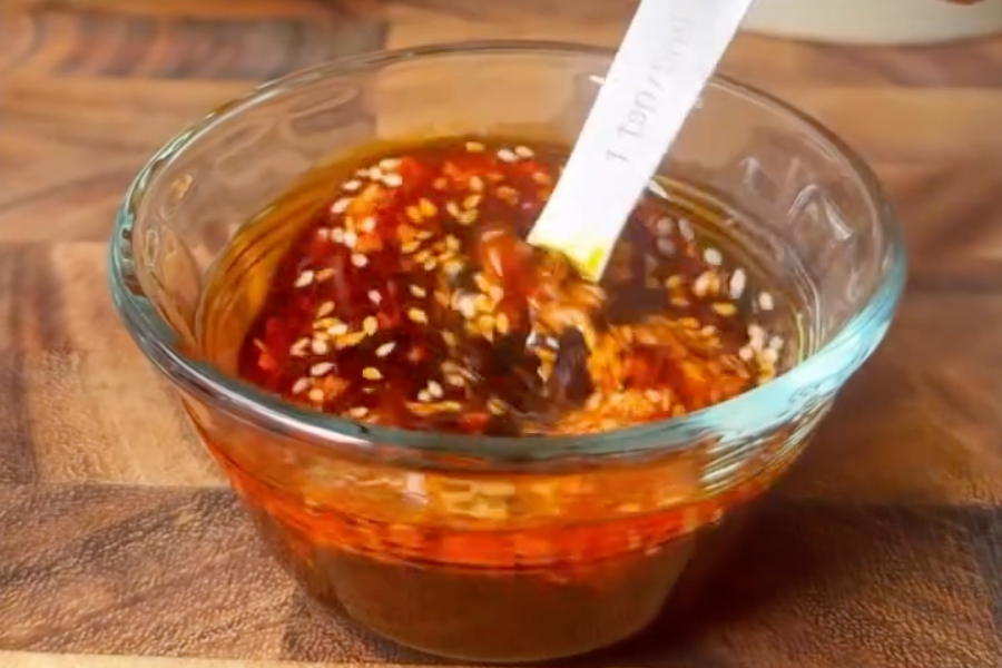 - Mix chili oil, soy sauce, vinegar, garlic, and sesame seeds.